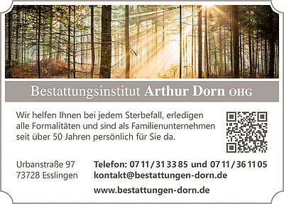 Seit über 50 Jahren ist das Bestattungsinstitut Arthur Dorn in Esslingen, Aichwald und Umgebung für Sie im Dienst. Nach unserem Leitspruch „Ehre den Toten – Dienst den Lebenden“ sind wir mit unserem Team Ihr vertrauenswürdiger Partner und zuverlässiger Ansprechpartner in den schwersten Zeiten.