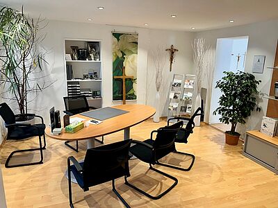 - Angemessene Räumlichkeiten und ein breites Sortiment von Trauerwaren