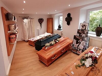 - Angemessene Räumlichkeiten und ein breites Sortiment von Trauerwaren