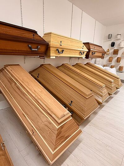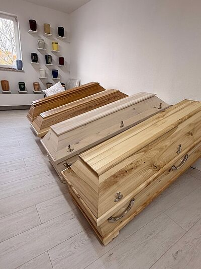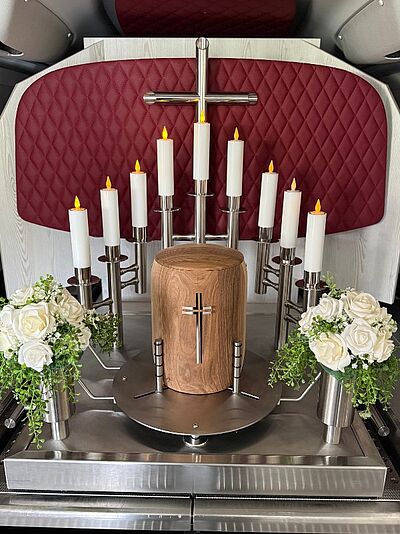 In unserem würdevoll gestalteten Abschiedsraum ermöglichen wir Ihnen die persönliche Verabschiedung ohne Zeitdruck am offenen oder geschlossenem Sarg.