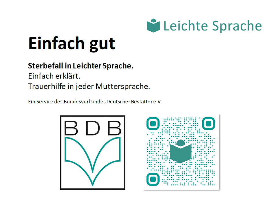 Der Bundesverband Deutscher Bestatter e. V. hat alle wichtigen Informationen zum Sterbefall in „Leichter Sprache“ zusammengefasst und mit einem kleinen Wörterbuch ergänzt. Die Inhalte sind anwenderspezifisch für die Nutzung auf Mobiltelefonen oder Tablets optimiert.