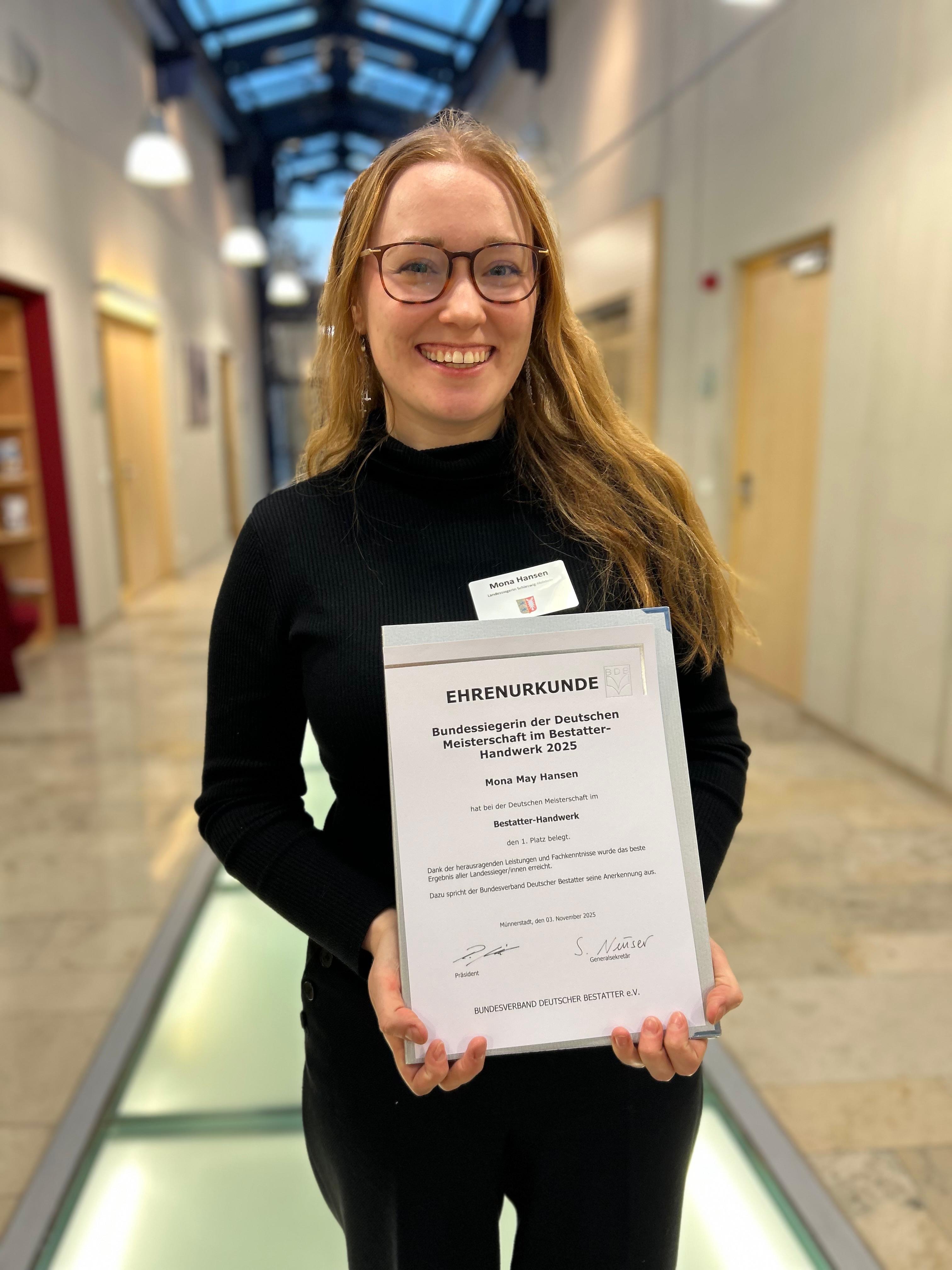 Nach anspruchsvollen theoretischen und praktischen Prüfungen stehen die Bundessiegerinnen 2025 fest: Den ersten Platz belegt Mona May Hansen aus dem Bestattungshaus Timm in Schleswig-Holstein. Den zweiten Platz belegt Katharina Neusiedler aus dem Bestattungsinstitut Hanrieder in Bayern, und den dritten Platz erreicht Sonja Tönsing aus dem Institut Deppe Bestattungen, einer Niederlassung von Niehaus Bestattungen in Nordrhein-Westfalen.