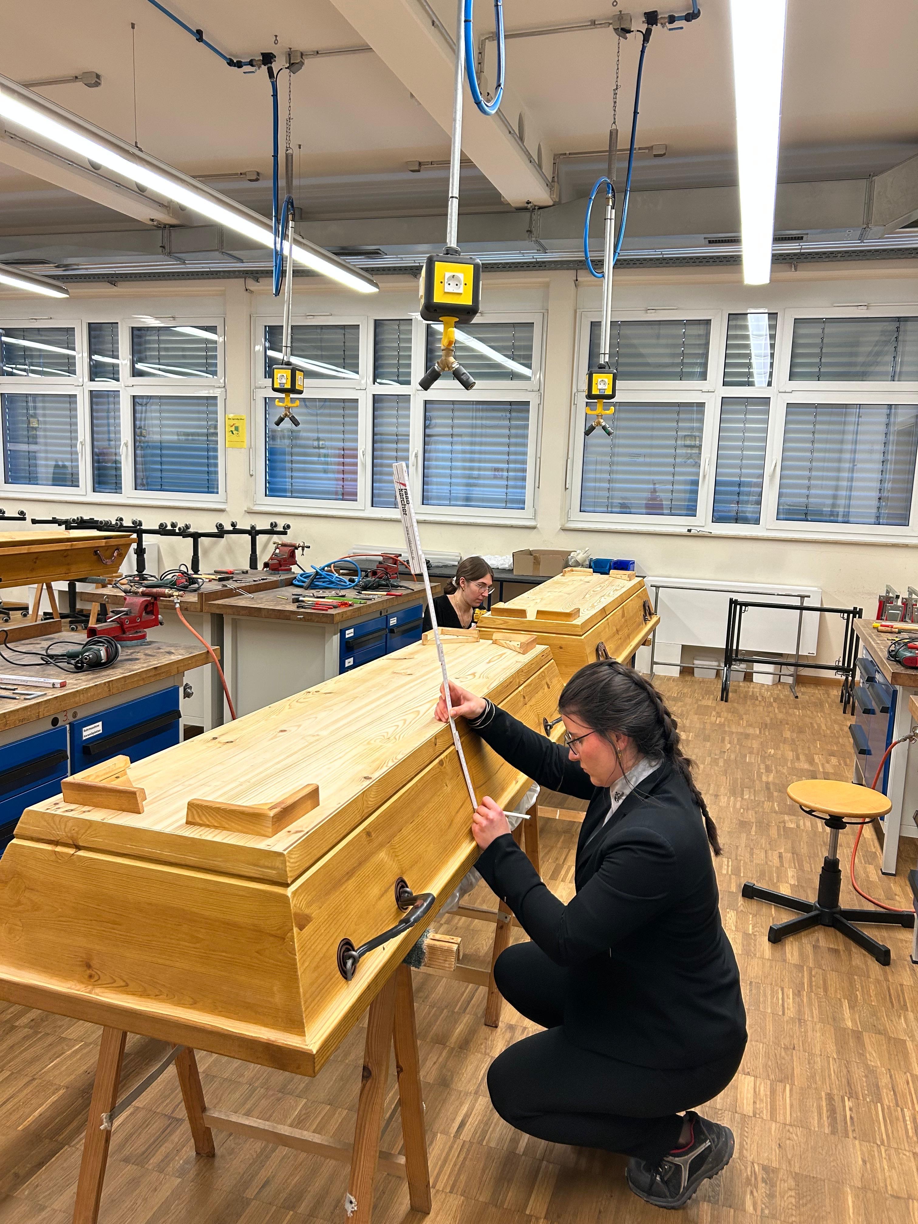 Im theoretischen Teil der Meisterschaft wurden die Fachkenntnisse in den Bereichen Recht, hygienische Versorgung, Trauerpsychologie und Grabtechnik geprüft. In der praktischen Aufgabe überzeugten die Teilnehmenden mit ihren handwerklichen Fähigkeiten beim Verschließen von Wunden und beim Anbringen eines Griffes am Sarg.