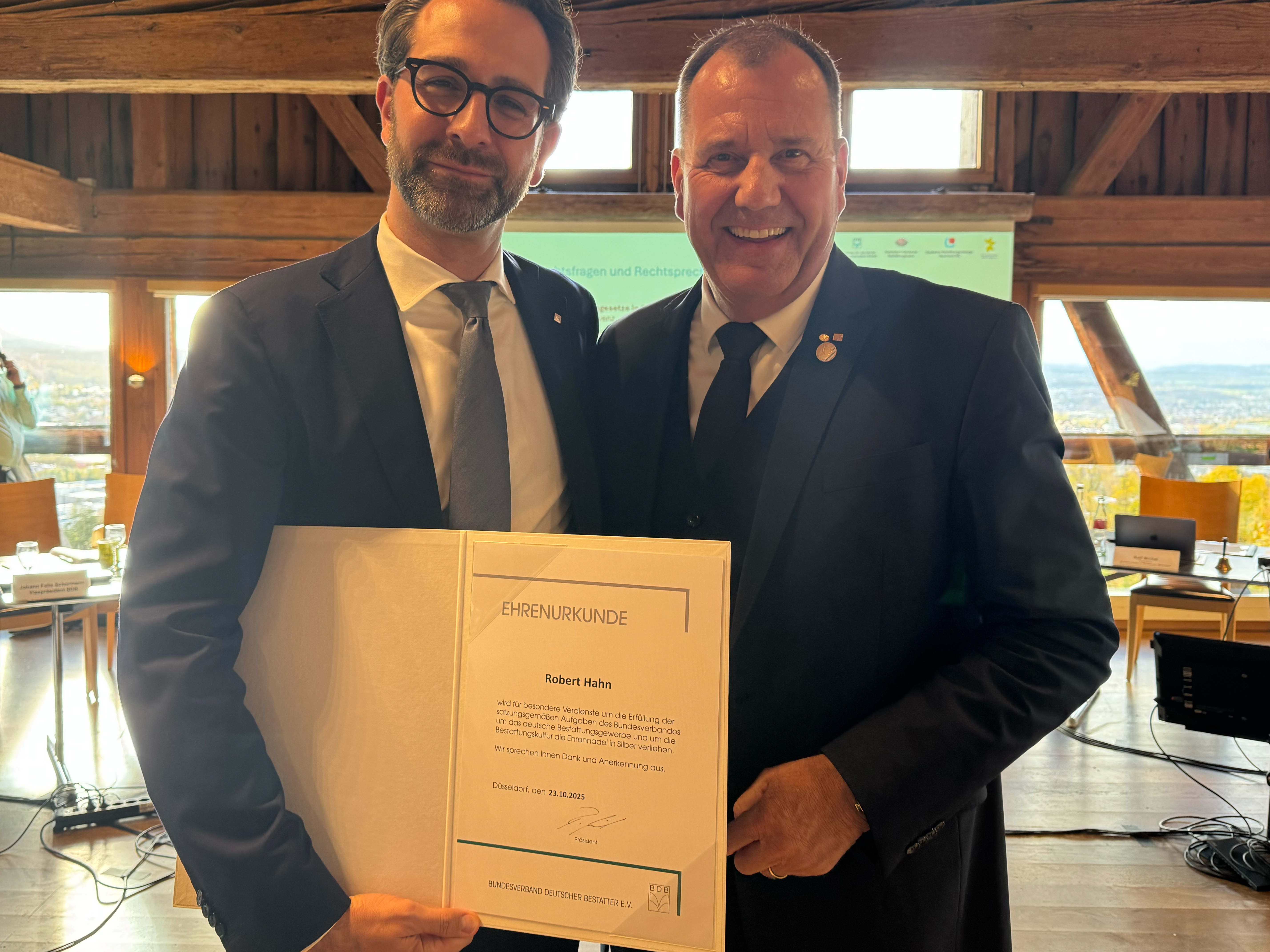 Der Bundesverband Deutscher Bestatter e. V. dankt allen Teilnehmenden, insbesondere den ehrenamtlich engagierten Mitgliedern in den Landesverbänden und -innungen, für ihren Einsatz für die Entwicklung in Handwerk, Branche und für die Menschen, die sie begleiten.