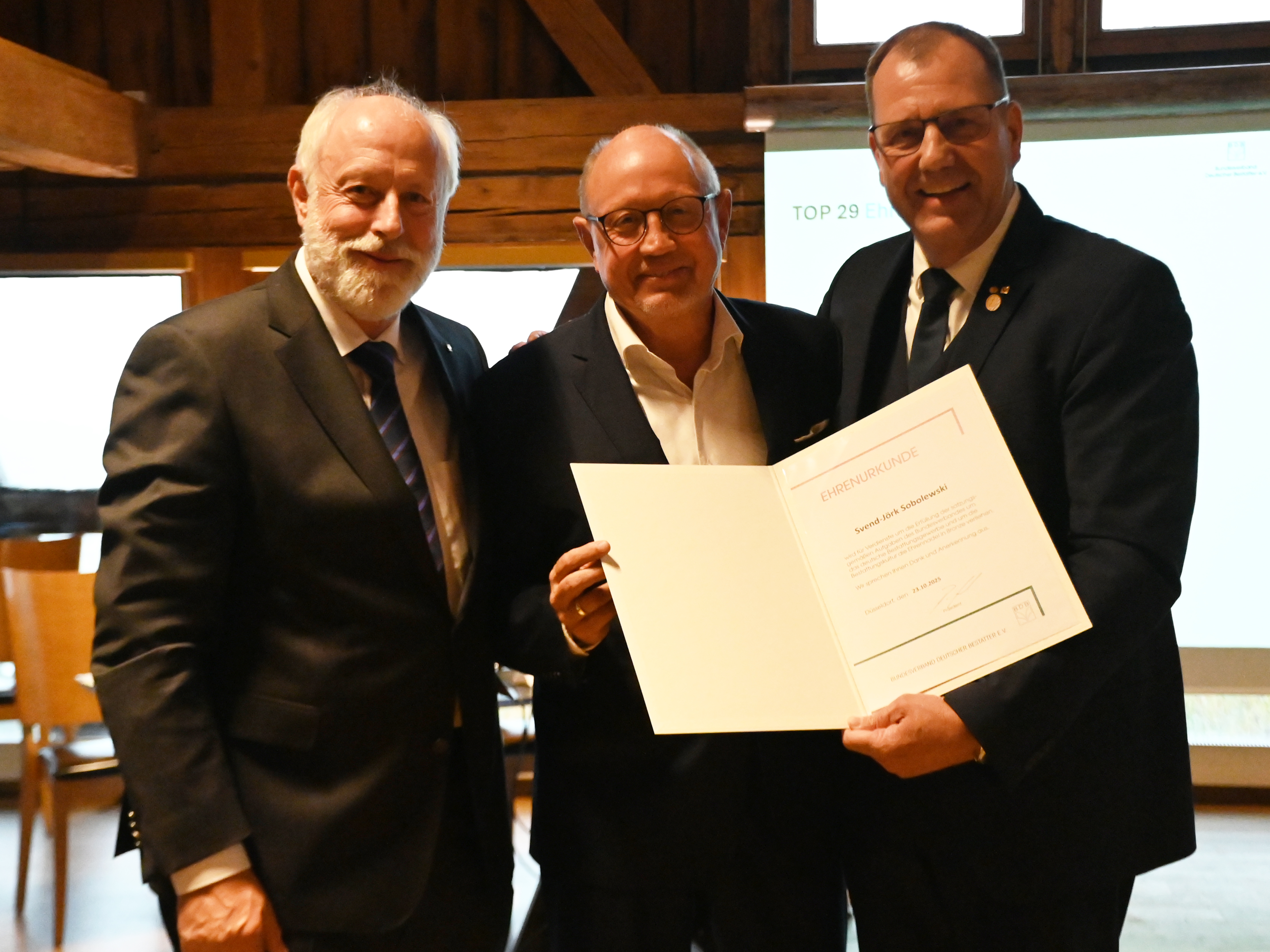 Außerdem wurden gleich mehrere Mitglieder für ihr Engagement geehrt. Die bronzene Ehrennadel des BDB ging an Herrn Svend-Jörk Sobolewski (stellv. Vertreter der Bundesarbeitsgemeinschaft Deutscher Krematorien), die silberne an Herrn Robert Hahn (Aufsichtsratsvorsitzender Deutsche Bestattungsvorsorge Treuhand AG). Mit den goldenen Nadeln wurden die beiden Vizepräsidenten, Herr Torsten Lange (Landesverband Mecklenburg-Vorpommern) und Herr Markus Maichle (Landesinnung Baden-Württemberg) für ihr Engagement in und außerhalb ihres Amtes gewürdigt. Desweiteren wurde die goldene Ehrennadel des Kuratoriums Deutsche Bestattungskultur ebenfalls feierlich vergeben. Die Mitglieder des geschäftsführenden Vorstands, bestehend aus Andreas Niehaus, Karl-Albert Denk und Andreas Dieckmann, wurden für ihr ehrenamtliches Engagement der letzten Jahre geehrt.