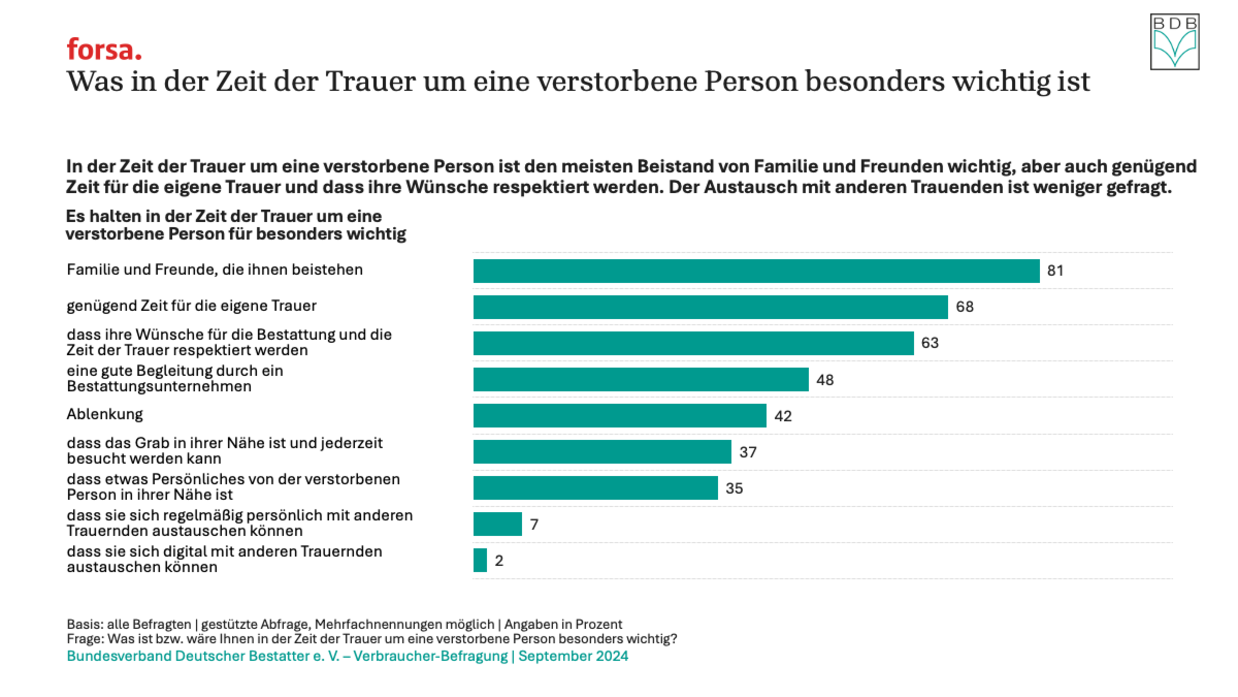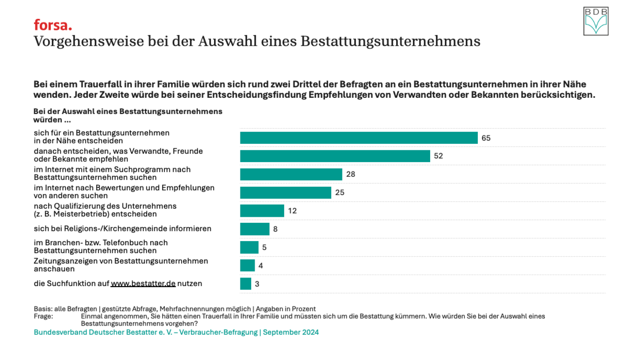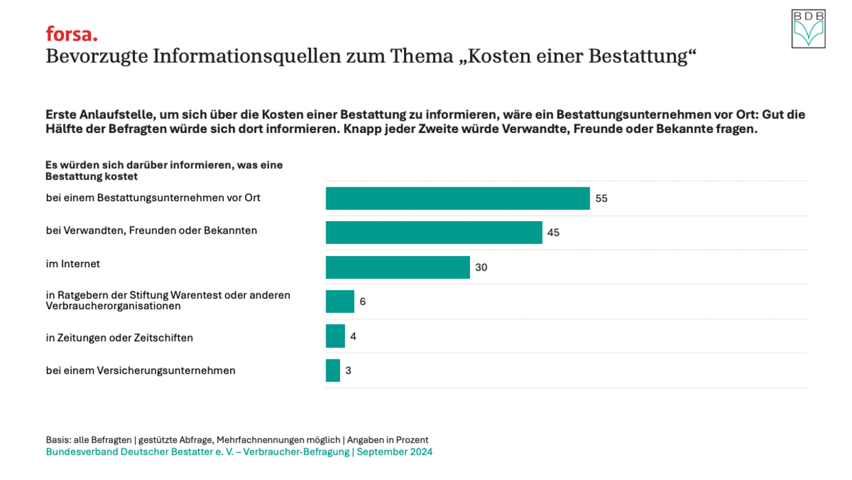 55 Prozent der Befragten wünschen sich eine direkte Beratung im Bestattungsunternehmen. Gespräche im Freundes- und Familienkreis folgen an zweiter Stelle. Rund 30 Prozent nutzen das Internet zur Information. Besonders Jüngere nutzen diese Möglichkeit. Digitale Angebote sind willkommen, aber eine rein digitale Betreuung lehnen viele ab.