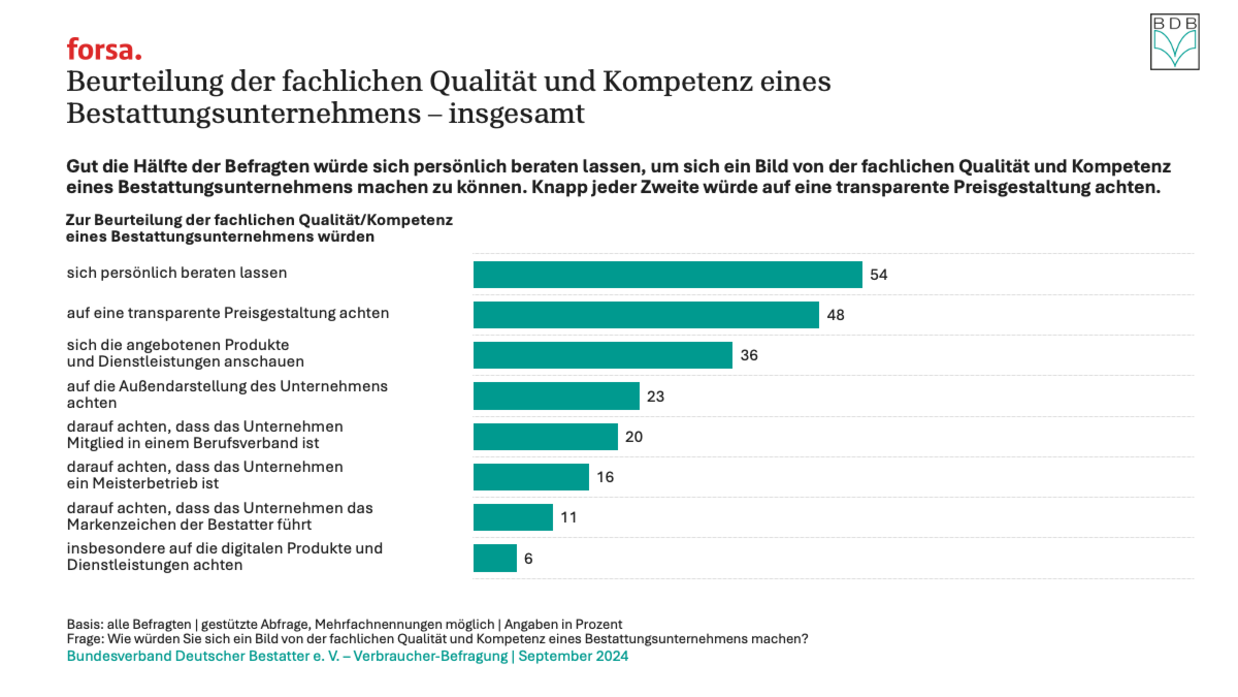Die persönliche Beratung ist für viele der wichtigste Weg, um die fachliche Qualität eines Bestattungsunternehmens einzuschätzen. 54 Prozent der Befragten würden ein persönliches Gespräch führen, um sich ein umfassendes Bild zu machen. Auch eine transparente Preisgestaltung ist für 48 Prozent ein zentrales Kriterium. Darüber hinaus achten viele auf die angebotenen Produkte und Leistungen sowie auf die Außendarstellung des Unternehmens.