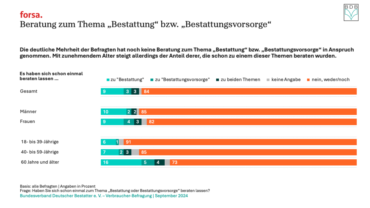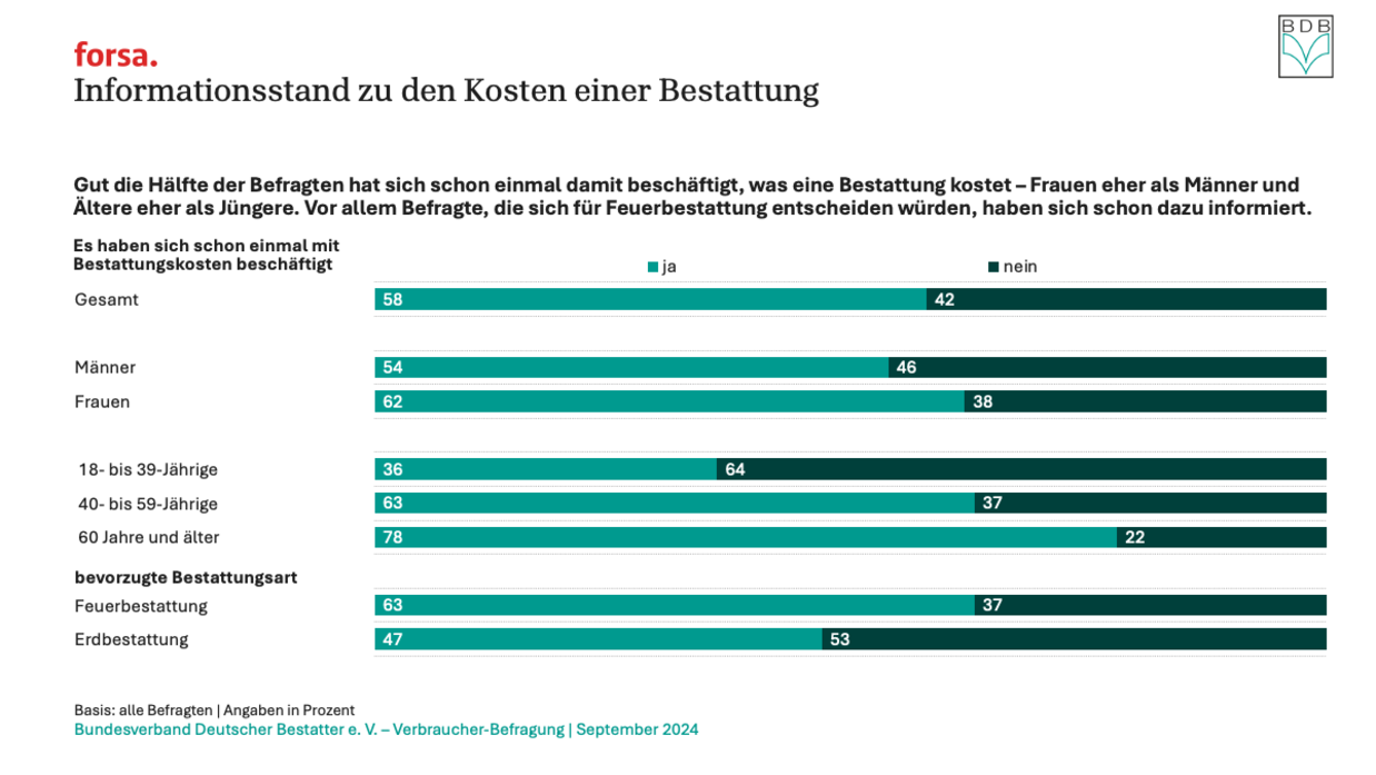 Mehr als die Hälfte der Befragten haben sich bereits mit den Kosten einer Bestattung auseinandergesetzt. Besonders häufig betrifft das Personen ab 40 Jahren. In der Altersgruppe 60+ sind es sogar 78 Prozent. Die Mehrheit bevorzugt eine persönliche Beratung vor Ort.