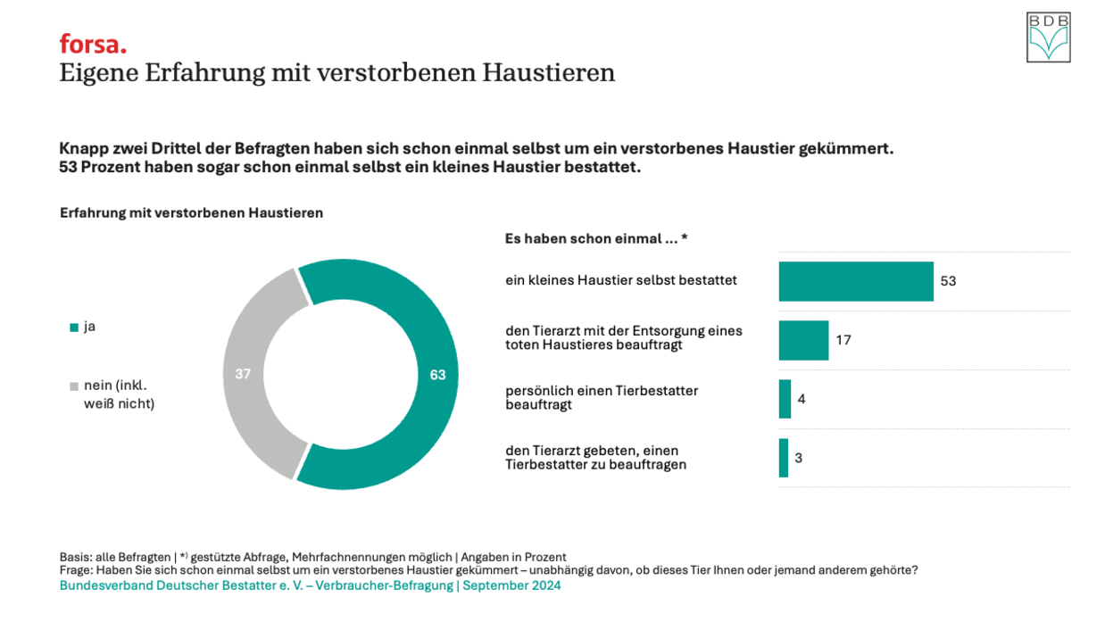 Fast zwei Drittel der Befragten haben sich schon einmal selbst um ein verstorbenes Haustier gekümmert. Die häufigsten Formen der Beisetzung sind der eigene Garten oder ein Tierfriedhof. Auch die Einäscherung ist für viele eine Option, um die Urne in der eigenen Wohnung aufbewahren.