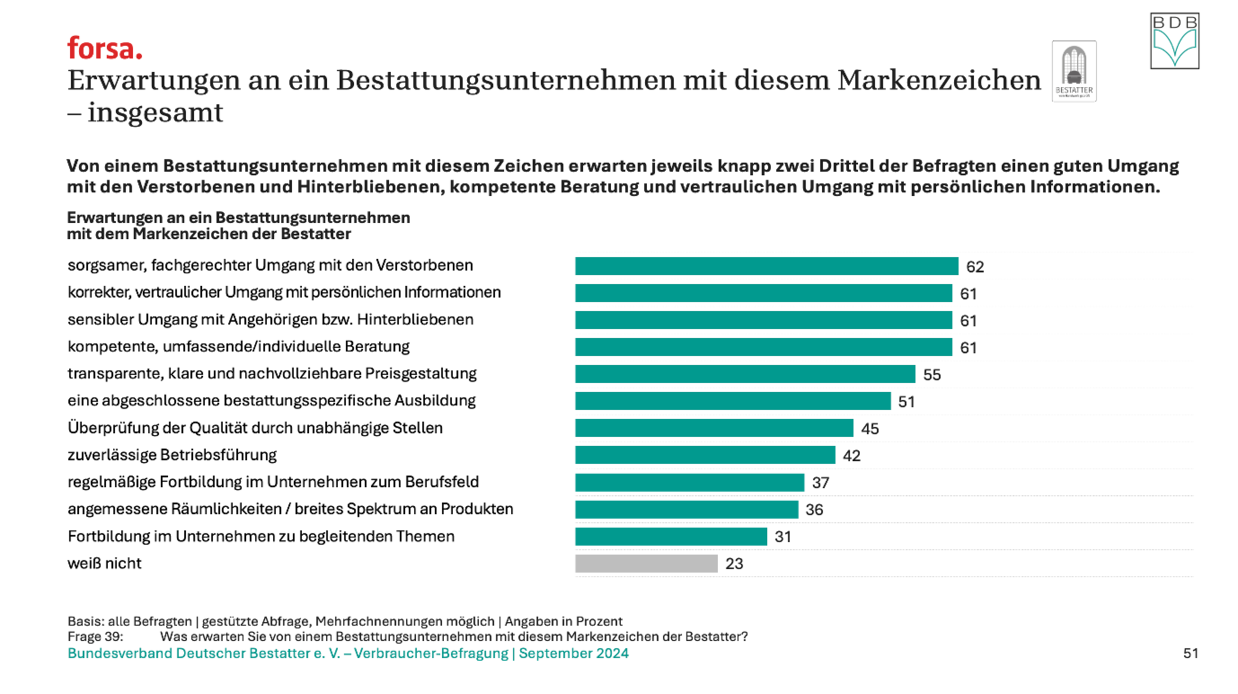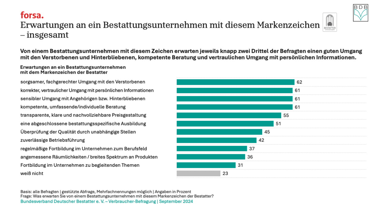 Von einem Bestattungsunternehmen, das das Markenzeichen trägt, erwarten knapp zwei Drittel der Befragten einen besonders respektvollen Umgang mit Verstorbenen und Angehörigen. Eine kompetente Beratung und der vertrauliche Umgang mit persönlichen Daten werden als selbstverständlich angesehen.