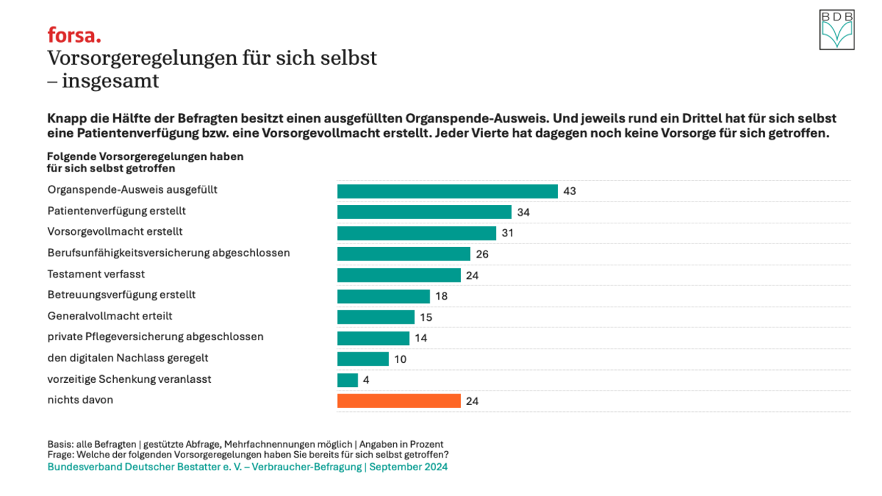 Haben Sie Ihre Vorstellungen hinsichtlich Ihrer eigenen Beerdigung/Beisetzung schriftlich festgehalten, also eine sogenannte Bestattungsverfügung verfasst? / (...) bereits einen Bestattungsvorsorgevertrag oder eine Sterbegeldversicherung abgeschlossen, um die Kosten für Ihre Bestattung (inkl. Trauerfeier) abzudecken?