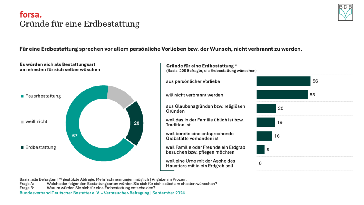 Trotz der Beliebtheit der Feuerbestattung bleibt auch die klassische Erdbestattung gefragt. Häufigster Beweggrund ist der ausdrückliche Wunsch, nicht verbrannt zu werden. Daneben spielen emotionale Aspekte wie familiäre Traditionen, religiöse Überzeugungen und persönliche Bindungen eine wichtige Rolle.
