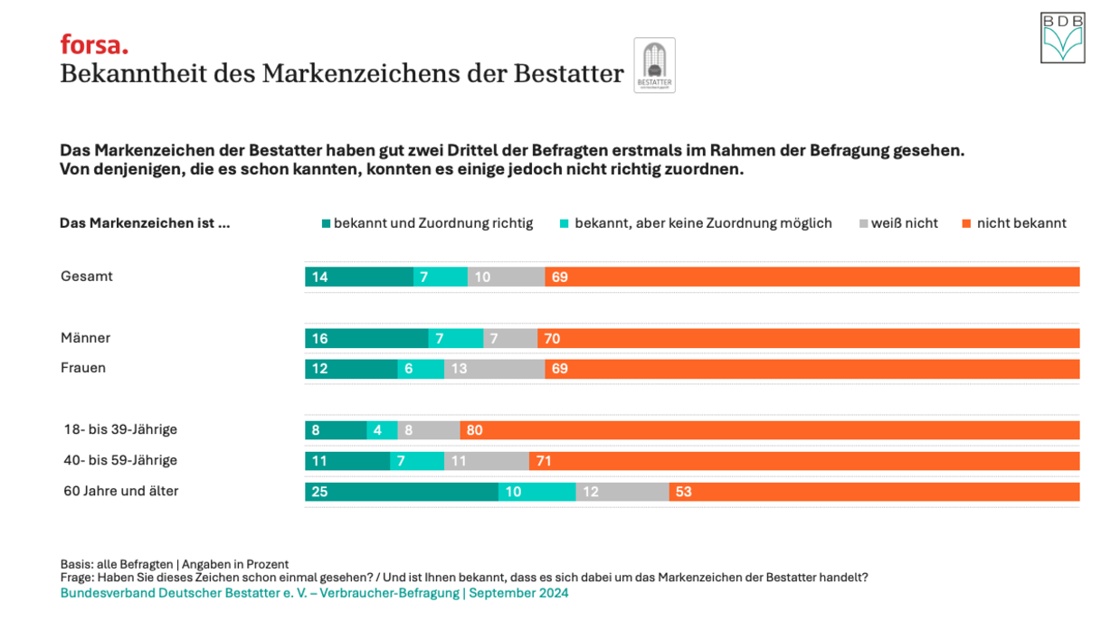 Über 25 Prozent der Befragten über 60 Jahre kennen bereits das Zeichen für zertifizierte Bestattungsunternehmen. Das zeigt, dass das Bewusstsein für Qualität und Standards in der Branche zunimmt.