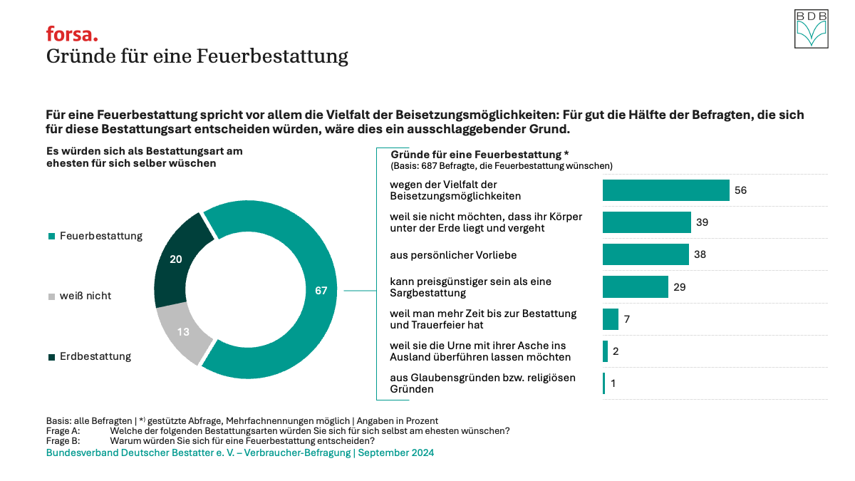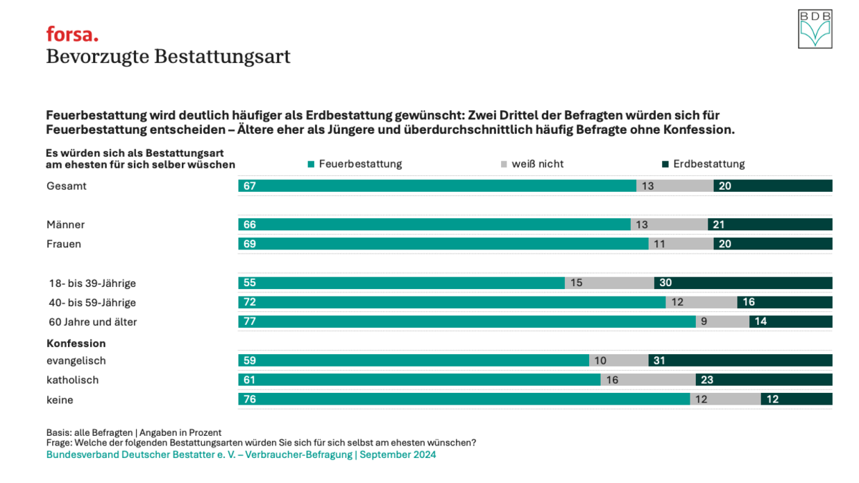 Die Feuerbestattung ist in Deutschland die am häufigsten gewählte Bestattungsform. Besonders ältere Menschen und Personen ohne religiöse Zugehörigkeit entscheiden sich häufig dafür. Auch die 18 bis 39-Jährigen bevorzugen mehrheitlich die Kremation, nennen im Vergleich zu älteren Generationen jedoch öfter die Erdbestattung.